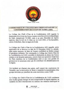 Dans un communiqué rendu public, le Collège des chefs d’État de la Confédération des États du Sahel (AES) a déploré « la destruction d’un drone des forces armées et de sécurité maliennes, suite à un acte d’hostilité du régime algérien dans la nuit du 31 mars au 1er avril 2025, près de Tin-Zaouatène, dans la région de Kidal ».