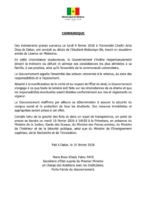 L’Etat s’est exprimé sur le drame survenu, ce lundi 9 février 2026 à l’Université Cheikh Anta Diop de Dakar. Lequel a conduit au décès de l’étudiant Abdoulaye BA, inscrit en deuxième année de Licence en Médecine ». « En cette circonstance douloureuse, le Gouvernement s’incline respectueusement devant la mémoire du défunt et adresse ses condoléances les plus attristées à sa famille, à ses proches, ainsi qu’à l’ensemble de la communauté universitaire. Le Gouvernement appelle l’ensemble des acteurs concernés à la retenue, au sens des responsabilités et à l’apaisement », lit-on dans le communiqué daté du mardi 10 février et signé par la Secrétaire d’État auprès du Premier Ministre, chargée des Relations avec les Institutions, Porte-parole du Gouvernement.